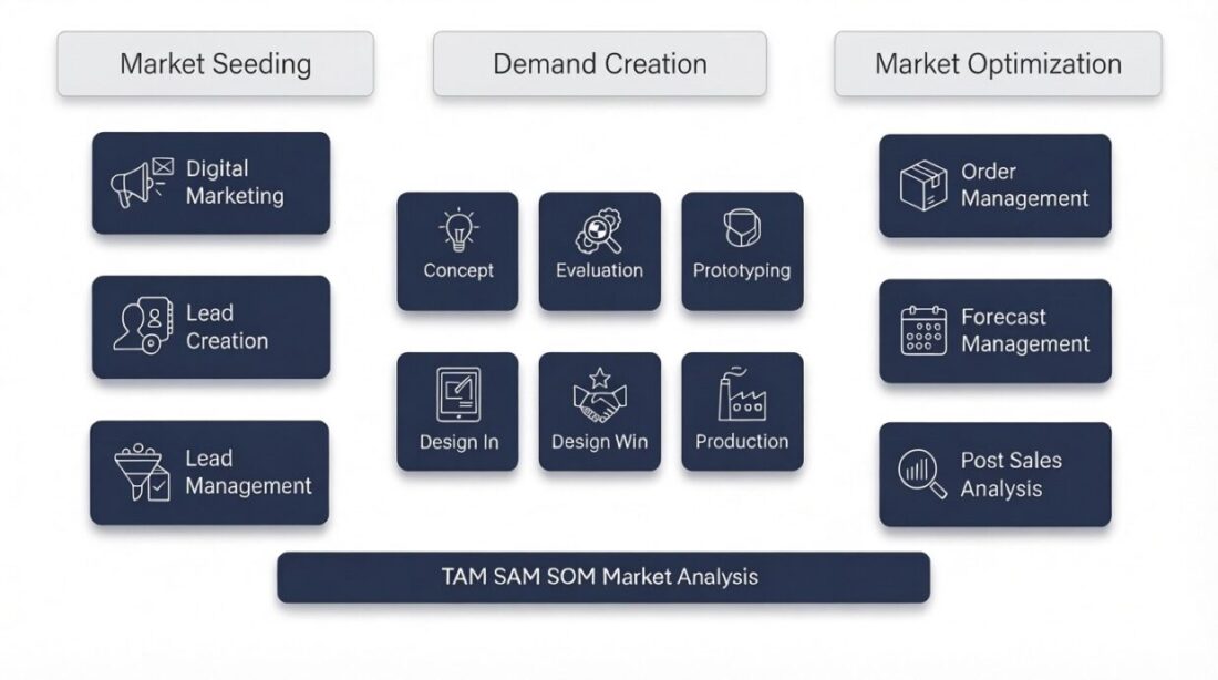 A single portal to review Total Available Market, Serviceable Available Market and Serviceable Obtainable Market integrated with Sales Performance, Forecasts, Design Wins, and Opportunity Pipeline
